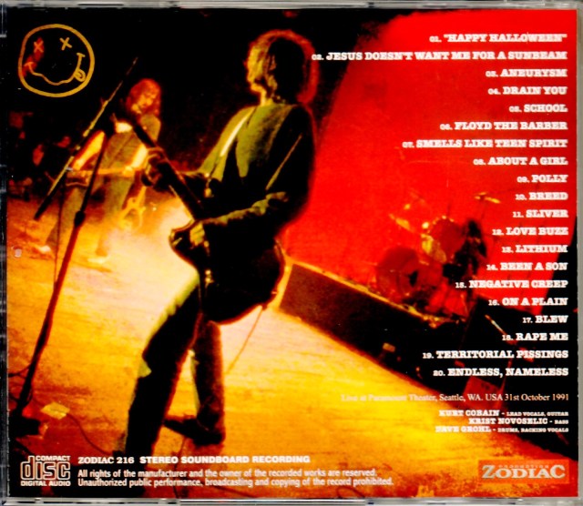 1. "Happy Halloween" 2. Jesus Doesn't Want Me For A Sunbeam 3. Aneurysm * 4. Drain You * 5. School * 6. Floyd The Barber 7. Smells Like Teen Spirit 8. About A Girl * 9. Polly 10. Breed 11. Sliver 12. Love Buzz 13. Lithium 14. Been A Son ** 15. Negative Creep *** 16. On A Plain * 17. Blew