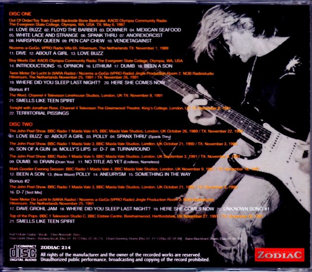 初期NIRVANAのラジオ音源を総括する極上ステレオサウンドボード・アルバムが登場です。当店では、NIRVANA研究の世界的権威の監修を受け、数々のサウンドボード・アルバムをお届けしてきました。特にデビュー前の研究的コレクションは単なる物珍しさ価値を超え、耳馴染んだテイクであっても聴いた事もなかったようなハイクオリティ・サウンドが衝撃的。「オフィシャル以上」と大好評を賜っております。本作は、その最新弾にして決定的なコレクションです。本作に収められているのは、結成直後の1987年5月から『NEVERMIND』で絶賛革命中の1991年12月までのラジオ収録をまとめたもの。整ったスタジオ・アルバムとは違う生演奏でありながら、観客を前にした混沌とも異なるスタジオ・ライヴが149分32秒にわたって繰り広げられる極上音楽遺産です。「初期のコンピレーション」と言うとやたら小難しそうな気もしてしまいますが、ラジオ放送だけにサウンド・クオリティは特級で、しかもメジャーになってからのテイクも多数。極初期を探る研究資料としても一級ではありますが、シンプルに「聴いてカッコイイ」コレクションでもあるのです。もちろん、今回も研究家自らが各音源とも現存するベスト・マスターを厳選。近年になって発掘されたプレ放送マスターも駆使していますが、それだけにこだわらない柔軟な姿勢で「ベスト」を追及しています。どういうことかと言いますと、一般にはプレ放送マスターがベストになるのですが、古い放送の場合は経年劣化でエアチェックの方が良好なケースもある。本作では、そのあらゆるケースを逐一追及し、あくまでも「最良の音」にこだわったセレクションなのです。そんな本作は2枚組ですが、大まかに言うとディスク1が本国アメリカの“KAOS OLYMPIA COMMUNITY RADIO”と、オランダの“VPRO RADIO”で収録されたもの。ディスク2はイギリスの“BBC”収録です。それでは各ディスクを詳しく見ていきましょう。