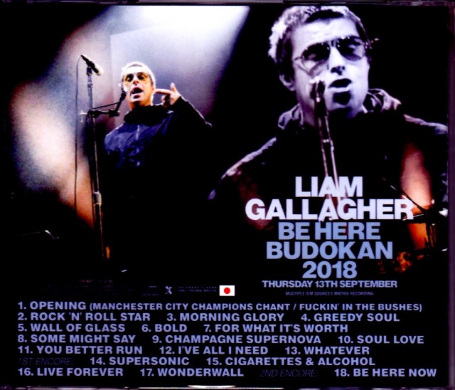 01. Opening (Manchester City Champions Chant / Fuckin' in the Bushes) 02. Rock 'n' Roll Star 03. Morning Glory 04. Greedy Soul 05. Wall of Glass 06. Bold 07. For What It's Worth 08. Some Might Say 09. Champagne Supernova 10. Soul Love 11. You Better Run 12. I've All I Need 13. Whatever –encore- 14. Supersonic 15. Cigarettes & Alcohol 16. Live Forever 17. Wonderwall -encore 2- 18. Be Here Now [Live at Nippon Budokan, Tokyo, Japan 13th September 2018 : 80min. Multi-Camera Aud-shot]