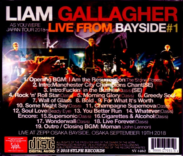 元オアシスのカリスマ・ヴォーカリスト、リアム・ギャラガーが、ソロ・アルバム「アズ・ユー・ワー」を引っ提げて来日!!その2018年ソロ初ジャパン ツアーより、9月19日に行われた大阪公演を、共に迫力&臨場感満点の極上級/超高音質にて完全収録!!リアルに表現されたヴォー カル&楽器隊、更にはステレオ感もバッチリの超ゴキゲンなサウンドにて至福ライヴを完全再現!!会場が一体となった臨場感や空気感も堪りません!!もち ろん丁寧なマスターリングも施された超エクセレントな逸品ですので、熱くさせられる事必至です!!今ツアーは、ソロ・アルバ ムからのナンバーはもちろん、オアシス・ナンバーもタップリ披露されるファン垂涎の内容となっております!!!オープニング「ファッキン・イン・ザ・ブッシーズ」「ロックンロール・スター」「モーニング・グローリー」のオアシス3連発に早くもノックアウト間違いなし!!中盤での、ピアノ伴奏のみで歌い上げる「シャンペン・スーパーノヴァ」や、本編ラストの名曲「ホワットエヴァー」も、胸が熱くなるライヴ・テイクで聴き応えも満点です!!アンコールは、なんとオアシス・ナンバー4連発!!!!「ワンダーウォール」のサビ部分はファンの大合唱が鳥肌ものライヴ・テイクです!!...etc、大阪初日は、リアムの体調不良とPAのヴォーカルバランスが気に入らなかったのか、「アイヴ・オール・アイ・ニード」「ビー・ヒア・ナウ」の2曲がカットされてしまいました。。。が、ファンの盛り上がりも凄く、「フォー・ホワット・イッツ・ワース」は、サビをファンの大合唱で乗り切った感涙のライヴ・テイ ク!!また終演アナウンスが流れる中、セカンドアンコールを求め帰らない激熱ファン等のリアム・コールが美しいクロージングとなっています!!オープニングBGM「僕の復活」ストーン・ローゼスもフル収録されおりますので、当日のライヴの模様を存分に追体験出来るアイテムです!!大阪2日目は、リアムの体調も完全復活といった感じで、「アイヴ・オール・アイ・ニード」と、セカンドアンコールでの「ビー・ヒア・ナウ」もしっかりと演奏され、ワールドツアー最終日ならではの素晴らしいパフォーマンスでファンを魅了しております!!細かな説明は不要でしょう!!とにかくファンなら必聴と断言!!極上サウンドにてお届けする追体験・大阪2DAYS決定盤!! ファン必携のメモリアル・アイテムが登場です!!