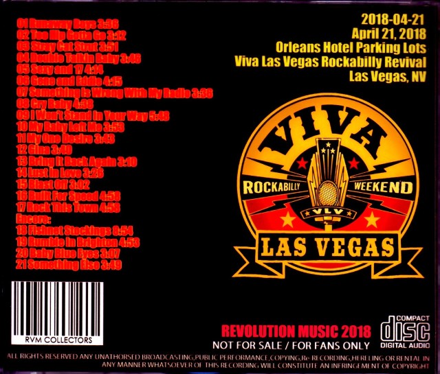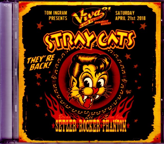 2018年4月18日~22日に渡ってラスベガスで開催されたイベント『ビバラスベガス・ロカビリーウィークエンド』から4月21日のステージに登場したストレイキャッツのライブを高音質ステレオ・オーディエンス録音で完全収録した最新音源が到着!! 野外特設ステージでのライブらしい抜けの良い音像で、チャットノイズがある箇所もありますがギター、ヴォーカル、コーラス含め大きめで各パート共にバランスよく収録されています。2018年復活初日の記念すべきステージとなったこの日は10年ぶりとなる北米公演で年明け早々にアナウンスされファンを狂喜させソールドアウトとなった公演。オープニングの"Runaway Boys"から飛ばしまくる最強のパフォーマンスで、リー・ロッカーがリーDオヴォーカルを取るエルヴィスで知られる名”"My Baby Left Me"のカバー、アンコールラストにはエディコクランの必殺カバ”"Somethin’ Els”"も含め、歴代のキラーチューンをたっぷり21曲披露しています! ファン待望の一夜をたっぷり堪能できます!ボーナシでモバイルも含む各種オーディエンス映像にて収録したDVDをプラス。トータル70分の収録で、演奏された21曲のうち、17曲の収録ゆえコンプリートではないものの、良好な映像ソースをセレクトしているので、安定したアングルが多数なうえ、音声は別レコーディングされたデジタル・オーディエンス・マスターを、フル・マトリックスした迫力あるサウンドにて。そしてイベントならではの盛り上がりの中、怒涛のネオロカ・ナンバー連発のショーは会場もノリノリで、ブライアン・セッツァーはやっぱりこれでなくては、と思うファンも多いハズ。