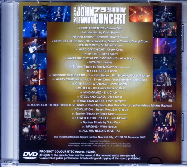 ジョンの生誕75周年を記念して、2015年12月5日、NY,NSGシアターにて開催されたトリビュート・ライブの模様を、後日USケーブル放送局AMCにてオンエアーされた映像より、オフィシャル・クオリティー、プロショットにて102分にわたり収録。まずスプーンによる”Cold Turkey”と”Hey Bulldog”のセカンド・バージョン、またリンゴ・スターのパフォーマンス・ビデオ、最後の”All You Need Is Love”のミス・パートなど放送されていない部分も多く、またオンエアーの放送順が実際のセットリストとは異なりバラバラで放送されているなど、いくつかの不満はあるものの、ヨーコのスピーチやポール・マッカートニーのビデオ・メッセージ、そしてスティーヴン・タイラにジョン・フォガティー、シェリル・クロウ、ウィリー・ネルソン等、豪華出演アーティストも多数の一大イベント・ライブゆえ、やはりファンは必見マスト・アイテム。