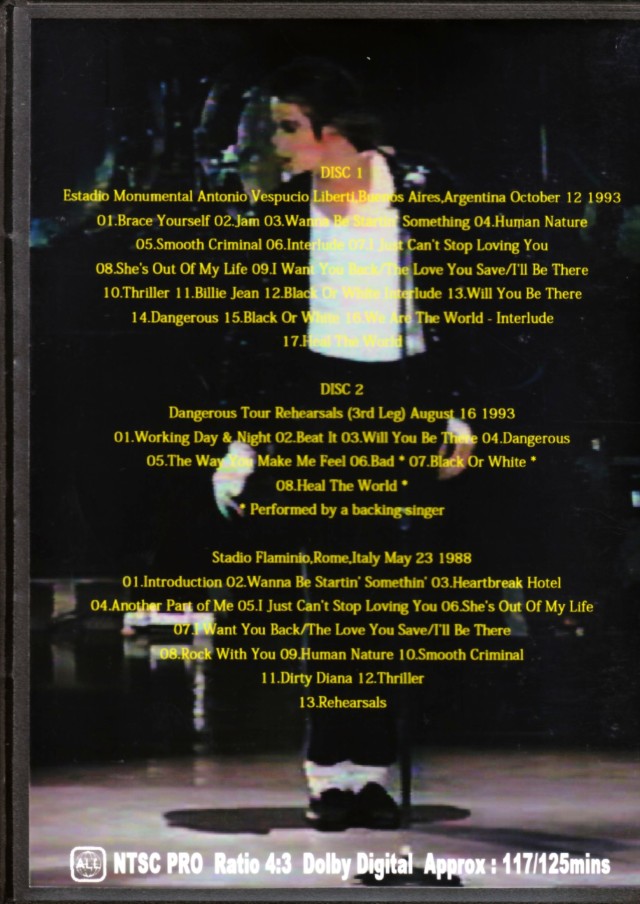 1992年「DANGEROUS」リリース後の来日公演も行なわれた「デンジャラス・ツアー」より、ツアー終盤となる、1993年10月12日アルゼンチン、ブエノスアイレス公演の模様を、近年再オンエアーされた、マスター・クオリティー、プロショット映像にて117分にわたりほぼコンプリート収録。まず前年には日本だけで実現した大晦日カウントダウン・ショーをはじめ、東京ドームのみ計8公演という来日公演が大きな話題となった中、本ツアーのプロショット・ライブ映像は、ブカレストのオフィシャル映像以外ほとんど皆無だったゆえ、このフルスケールによるライブはファン必見といえるもの。さらにdisc:2には、同年8月16日、ツアー・サード・レグに向けてのリハーサル映像もプロショットで収録。後半3曲はバックシンガーだけのパフォーマンスもあるものの、これまで流通していたネバーランドでのリハーサル・テイクとは違った内容となるもの。さらにはボーナス的に1988年「BAD TOUR」ヨーロッパ・レグにおける5月23日イタリア、ローマ公演の模様も、マスター・クオリティー、プロショットにて収録。こちらはコンプリートではないものの、これまでダイジェストで流通していた映像よりも、リハーサルを含めて30分ほど長く、映像クオリティーも数ランク・アップしているもの。そして当時はそのツアーの規模は空前絶後で、巨大なステージセットに、数々のセッションで有名なグレッグ・フィリンゲンズ、後にジェフ・ベックとの活動でも有名な女性テクニカル・ギタリストのジェニファー・バトン、バックヴォーカルを務めていたシェリル・クロウら11人編成のバンドに、4人のダンサーというマイケルを入れて総勢16人という大所帯に。そしてジャパン・ツアーから始まり、極東、ヨーロッパ、2回の北米という約1年半に及ぶ大規模なワールドツアーの中、イントロから鳥肌の"Wanna Be Startin' Somethin'"、シェリル・クロウとの感動的なデュエット"I Just Can't Stop Loving You"、圧倒的なパフォーマンスで大盛り上がりな"Thriller"など、こちらも必見内容となる、トータル125分。