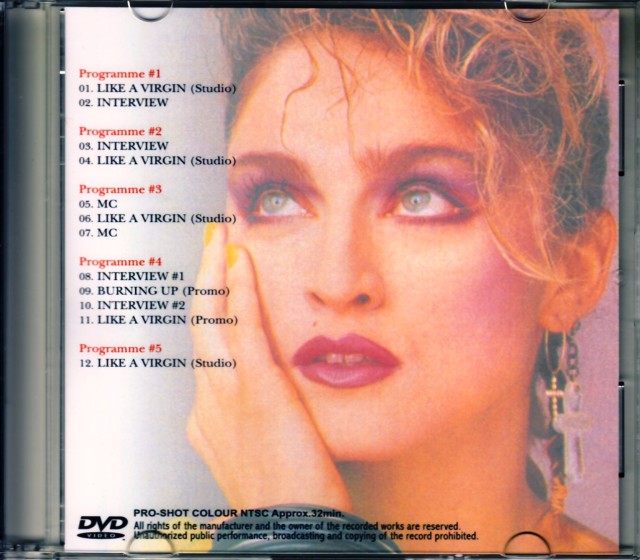 1985年1月に実現したマドンナの最初のプロモーション来日で収録・放送された5番組をコンピレーションしたファン必携・必見の一枚。この時の来日はマ ドンナとマネージャーとのたった二人での来日(2005年のプロモ来日は48人での来日だったそうです。)。収録されている番組は「オールナイト・フ ジ」、「夜のヒットスタジオ」、「11PM」「ベストヒットUSA」「ミュージック・フェア」で、最初の「オールナイト・フジ」は来日直後(着いたその 日!)の土曜日の夜の収録で、この時、マドンナは「疲れているから出たくない」と駄々をこねたそうですが、レコード会社の担当さんが(当時ライバル視され ていた)「シンディ・ローパーも出たんだから」と説得した、という逸話も残っています。ちょうど、この来日中にシングル「Like A Virgin」がアメリカのチャートで一位になった時期でちょうど、昇り調子の絶好調にあった時期ですが、日本では注目されているとはいえ、まだまだ初来 日のド新人。一週間の間に数々のテレビ、雑誌とメディア露出を敢行したわけですが、本作は、テレビ音楽番組に出演したマドンナの姿をリアルに捉えていま す。スタジオでのパフォーマンスは勿論全て口パクですが、エネルギッシュにマイムする若きマドンナの姿はどれも見応え満点。「オールナイト・フジ」は女子 大生の方達の前でマドンナが喋るという今では考えられない構図。松本伊代が「素敵なプロモーションですね。スリーサイズはいくつですか?」と聞くとマドン ナが「それはシークレット・インフォメーション」という会話も素晴らしいですが、カメラが勝手にバストアップを撮影するという、これまた今では考えられな いショットも観ることができます。「夜のヒットスタジオ」では堀ちえみがマドンナからリストバンドをプレゼントされるというシーンも見れます。こちらはパ フォーマンスも生中継映像で、まだ初々しいムードのマドンナが、ここでも踊り歌いながらパフォーマンスする貴重な映像を楽しめますが、2分30秒目辺り で、激しいアクションに髪留めがほどけて落下してしまい、それを踊りながら拾おうとするマドンナの動きを確認することができます。(この曲では後半、故意 に髪留めを解くアクションをするようですが、この生放送では、自然に取れてしまっており、慌ててアクションを変更している様子が確認できます。)最高・最 強なのは「11PM」で、お色気色の強い番組らしく、マドンナの宿泊していたホテルの部屋(使用済み)をベッドルームからシャワールームまで念入りに撮 影、「残念ながら何も落ちてませんでした」という凄い昭和ギャグをかましているのが凄いです。最近他界されたコメンテーターらの御姿、そしてユーモア溢れ る強烈なコメントが実に素晴らしく、非常に楽しめます。大変貴重な11PMオリジナルのスタジオパフォーマンス(Like A Virgin)も最高ですが、その後の(凄く綺麗な)女性司会者の「(なんなのこの娘、と言いたげな感じで)結構わがまま言ってましてね、VTR撮るとき に私2回しか歌わないし、アクションもどんどんやるから勝手に撮ってって言ったんです」というコメントも、故小野やすし氏の「あんな風に歌って踊れる娘は 日本にもたくさんいるんです。そっちはポロっとだしちゃったりしてくれて」と言うコメントも含め、その全てが、この時期だからこその強烈な見所となってい ます(笑)。「ベストヒットUSA」でのインタビューは純正音楽番組だけあって非常にまともで、マドンナも小林克也氏の流暢な英語会話にご機嫌に応じてい ます。ラストは「ミュージック・フェア」(実際の放送は2月17日)で、来日スタジオ・パフォーマンス映像としては最も優秀で高品質な傑作映像で、日本語 対訳も付いています。記録としても一級品。洋楽ファンなら誰もが絶対に楽しめる32分です。