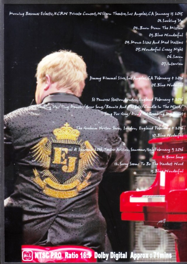 2015年は来日公演も大盛況だったエルトン・ジョンの、2016年初頭は33枚目のスタジオ・アルバムとなる「Wonderful Crazy Night」のプロモーションのため、各地でTV出演もこなすことに。その模様を各種コンパイルしたのが本タイトルで、1月13日に収録された、ロスのKCRWラジオ・プログラム「Morning Becomes Eclectic」や、1月18日に収録されたおなじみ「Jimmy Kimmel Live」。また2月4日「The Graham Norton Show」の前に行われたサプライズ・ライブや、2月9日のサンレモ2016でのパフォーマンスも収録した、トータル71分。