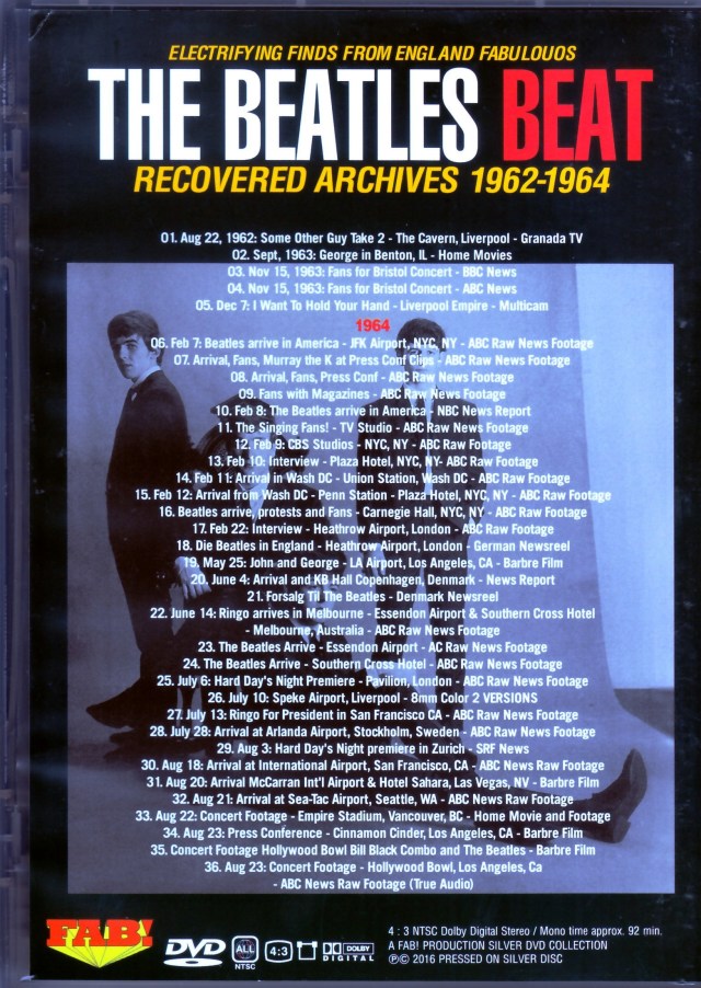 海外製ビートルズ映像アンソロジーの決定版シリーズ“RECOVERED ARCHIVES”DVD第一弾!世界中のビートルズ・コレクターが注目するFAB PRODUCTION製作のオリジナル・レア映像コレクション”RECOVERED ARCHIVES”シリーズがDVDで登場!数多いビートルズの映像マテリアルを時系列にまとめたこのシリーズはこれまで知られている代表的なTV出演やライブはもちろん世界中のニュース映像から貴重な記録フィルムに至るまで現存するビートルズの映像をくまなく網羅したコレクター必見の映像アンソロジーです。以前には見ることが出来なかった珍しい映像や近年新たに発掘され画質・音質や内容が向上した映像が多く含まれたビートルズ映像コレクションの決定版シリーズ!第一弾はデビュー当時の62年から世界中にビートルズ旋風を巻き起こした64年までの4タイトルをお届けします!◆ 1964年2月初のアメリカ上陸での熱狂ぶりを伝えるニュース映像からデンマークやオランダ、オーストラリア等各国、64年8月全米ツアーの様子さらには歴史的コンサート、ハリウッド・ボウル公演までビートルマニアの貴重映像たっぷり収録。