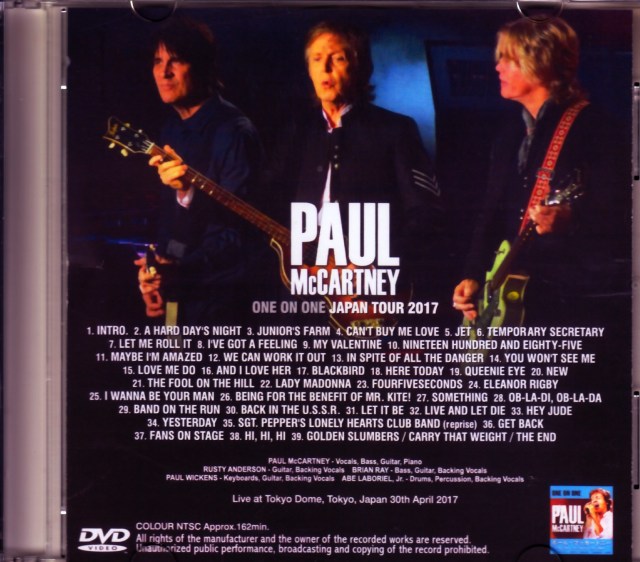 リリースラッシュに湧く“ONE ON ONE JAPAN TOUR 2017”。その最終日「4月30日:東京ドーム公演」の極上席を体験できるフル映像がリリース決定です。東京ドームを揺るがした来日公演から1週間以上が経ちましたが、あの感動の記憶も日々の喧噪に薄れ始めている頃ではないでしょうか。数々のライヴアルバムで思い起こすことはできますが、朧気な短期記憶を確かな想い出に変えるには、映像に勝るものはありません。本作は、そんな体験感に溢れたリアル・ショットなのです。本作最大のポイントは、“映像美”・“近さ”・“一気貫通”の三拍子。最新デジタル機材によるビビッド画質なのですが、そのクオリティで映し出されるポールの近いこと! 果敢なズームを多用しているために詳しい撮影ポジションは分かりませんが、ステージを間近に捉えつつ、やや見上げた視線からすると恐らくは「A7ブロック」辺りだったのではないでしょうか。会場のスケール感も巨大モニターのスペクタクルもそっちのけで、とにかくポールの仕草や表情、ギターを操る指使いまでよく見える間近ポジションなのです。さらにサウンドも素晴らしい。さすがに音の専門家である名テーパー達が録った傑作ライヴアルバムには及ばないかも知れませんが、間近席ならではの極太楽音が耳に流れ込み、割れも歪みも起こさない。何よりも驚くのは、オーディエンス・ノイズが極端に少ないこと。もちろん、曲間には喝采も起きるものの、演奏中はまるでライン録音かのように楽音と歌声だけに占領されるのです(もしかしたら、映像とは別の録音をシンクロさせているのかも知れません……)。そのクオリティで描かれる“一気貫通の体験感”こそが本作の命。動画サイトに氾濫する1曲単位の映像ではなく、マルチカメラ仕様でもない、ワンカメラ&フルの“体験感”。テンションが爆発するオープニングも、ド迫力の「Live and Let Die」も、この日だけの「Get Back」も、母娘ファンをステージに上げてハグする微笑ましい「Hi, Hi, Hi」も、紙吹雪が舞う大団円のエンディングも……。そのすべてを間近な極上席で目撃できるのです。2年という短いスパンでありながら、今回も苛烈なチケット争奪戦が起きたポールのジャパンツアー。現場に居合わせても、巨大モニターと米粒のようなポールを見比べていた方も多いことでしょう。本作に収められているのは、限られた人間だけが知りうる“極上席の光景”なのです。あの想い出を鮮やかに蘇らせてくれるだけではなく、ほとんどの方が知る由もなかった極上視点でフルショウを味わわせてくれる傑作映像。