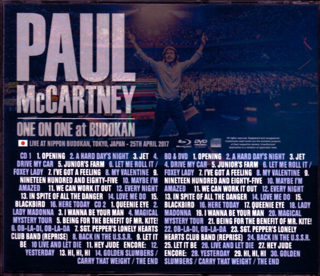 CD 1 01. Opening 02. A Hard Day's Night 03. Jet 04. Drive My Car 05. Junior's Farm 06. Let Me Roll It / FoxeyLady 07. I've Got a Feeling 08. My Valentine 09. Nineteen Hundred and Eighty-Five 10. Maybe I'm Amazed 11. We Can Work It Out 12. Every Night 13. In Spite of All the Danger 14. Love Me Do 15. Blackbird