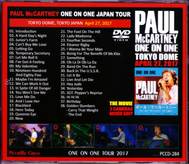 2017年待望のポール・マッカートニー再来日公演が行なわれた。直近2度の来日公演がOUT THEREツアーだったのに対し、今回はツアー名も新たにONE ON ONEツアーと題され、再び日本の地にやってきたのである。今回は全4公演が組まれ、しかも初日はあの伝説的な武道館公演で開幕し、その後東京ドーム3連続であった。本作は、その初日2017年4月27日東京ドーム公演を映像で完全収録している。 本作は3カメラ・ミックスで多様なアングルで構成されており、見応え充分。アリーナからのかぶりつき直近カメラが2台、そして全景を映すスタンドからのカメラ1台を駆使して、見る者を飽きさせない編集が施されている。開演前のあの特徴的な武道館の天井、そして会場内には「The End」のカバー・バージョンが流され暗転する。その瞬間の盛り上がりときたら、これほど胸躍るワクワクする場面も人生においてそうないであろう。 本作の、特にメインとして使用されているアリーナからのショットは必見である。ポールの顔が画面ギリギリいっぱいドアップで肉薄し、くるくる変わる表情、一生懸命に歌う口元、そして額から流れる汗までもハッキリと映っている素晴らしいショットの数々。右手の運指までもが鮮明に見ることができる。萌えポイントとも言うべき「マッカな瞬間」は数知れずあり、ファンならずとも必見の映像作品である。 とにかく、通して見ると、あの時の感動、あの時の胸ときめく瞬間の記憶が、脳裏にまざまざと蘇ってくる。長いコンサートを一気に観終えてしまうくらい飽きない編集と相俟って、コンサート自体を追体験できる最適のDVDとなっている。まさにもう一度コンサートをそのまま再現してくれる想い出のタイトルとなるであろう。 3カメラの映像をミックスした迫力ある近距離映像、そして音声はカメラ付随のマイクではなく、別途収録された高音質の音をシンクロさせている。
