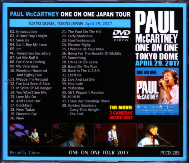2017年待望のポール・マッカートニー再来日公演が行なわれた。直近2度の来日公演がOUT THEREツアーだったのに対し、今回はツアー名も新たにONE ON ONEツアーと題され、再び日本の地にやってきたのである。今回は全4公演が組まれ、しかも初日はあの伝説的な武道館公演で開幕し、その後東京ドーム3連続であった。本作は、その初日2017年4月29日東京ドーム公演を映像で完全収録している。 本作は3カメラ・ミックスで多様なアングルで構成されており、見応え充分。アリーナからのかぶりつき直近カメラが2台、そして全景を映すスタンドからのカメラ1台を駆使して、見る者を飽きさせない編集が施されている。開演前のあの特徴的な武道館の天井、そして会場内には「The End」のカバー・バージョンが流され暗転する。その瞬間の盛り上がりときたら、これほど胸躍るワクワクする場面も人生においてそうないであろう。本作の、特にメインとして使用されているアリーナからのショットは必見である。ポールの顔が画面ギリギリいっぱいドアップで肉薄し、くるくる変わる表情、一生懸命に歌う口元、そして額から流れる汗までもハッキリと映っている素晴らしいショットの数々。右手の運指までもが鮮明に見ることができる。萌えポイントとも言うべき「マッカな瞬間」は数知れずあり、ファンならずとも必見の映像作品である。 とにかく、通して見ると、あの時の感動、あの時の胸ときめく瞬間の記憶が、脳裏にまざまざと蘇ってくる。長いコンサートを一気に観終えてしまうくらい飽きない編集と相俟って、コンサート自体を追体験できる最適のDVDとなっている。まさにもう一度コンサートをそのまま再現してくれる想い出のタイトルとなるであろう。 3カメラの映像をミックスした迫力ある近距離映像、そして音声はカメラ付随のマイクではなく、別途収録された高音質の音をシンクロさせている。