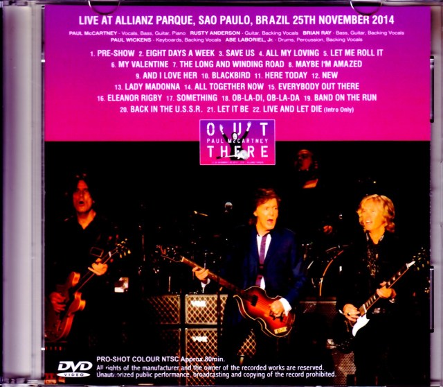 “OUT THERE! 2014”を代表する極上プロショットがリリース決定。本作に収められているのは、2014年最後のライブ・スケジュールとなった南米ツアーのうち、「2014年11月25日サンパウロ公演」。このショウはマルチカメラのプロショットで撮影され、全世界に公開された映像。ライヴ直後からさまざまな動画サイトにも溢れ返りましたが、本作はそれらとは一線を画す極上マスターからダイレクトにDVD化したものです。実際、そのクオリティは驚異的。残念ながら2013年の日本公演のような完全版ではなく、ライヴが後半に差し掛かったところまで(「Live And Let Die」最初の花火と同時に放送が終了します)なのですが、クオリティ自体は日本公演さえも凌駕する。画質・音質はもとより、サウンド・プロダクションにカメラ・ワーク……その総てがまさに「オフィシャル級」。近年のプロショットでも屈指の大傑作なのです。そんな映像美で描かれる“OUT THERE! 2014”。実は当時、結構衝撃的でもありました。2014年と言えば、ポールの急病で日本公演がキャンセルになりましたが、本作のサンパウロ公演はその半年後。6キロも体重を落としたというポールの姿に不安になったものです。特に、彼がピアノ・ナンバーを弾く際に顔がクローズアップになるとよく解る。日本公演と見比べても一目瞭然ですし、あまりに画質がクリアなこともあって老けて見えてしまうのです。しかし、その一方で肝心要の演奏や歌声は絶好調。それどころか「Ob-La-Di, Ob-La-Da」のキビキビとした動きなどからは、むしろ痩せたからこその“身軽さ”まで感じられる。それに対する盛り上がりも素晴らしい。南米公演と言えば常に熱狂的なものですが、この「Ob-La-Di♪」での盛り上がりをみせた場面は最高潮。演奏がスタート当初から客席には風船が溢れ(ストーンズのハンプトンそっくり)会場内を飛び交う。しかも、それだけでは収まらず、演奏が終わった後も止まない合唱に触発されてポールたちがこの曲でリプライズを展開するという場面まで飛び出します。この曲を歌っている最中でポールの声がひっくり返ってしまうシーンもあるのですが、そこでも余裕の表情でやり過ごしている。これ1曲だけでも非常に楽しめるライヴ映像なのです。また、この日の「Maybe I'm Amazed」も素晴らしい演奏。ポールの声もよく出ているだけでなく、彼がピアノを連打したかと思えばラスティ・アンダーソンはギターを弾きながら観客を煽って見せるなど、白熱の演奏シーンが描かれる。その一方で、この放送はキーボードのウィックスがほとんど映し出されないという不思議なカメラ・ワークでもあるのですが、それも曲後半で思い出したように連続して映し出される。いかに技術・クオリティが上がっても、どこかズッこけてしまうところも南米らしいと言いますか、妙に面白くなってしまいます。この日の凄まじい盛り上がりはアコースティック・ナンバーで観客の号泣する姿が映し出されるといった場面からも伝わってくるのですが、それ以上に二度に渡って「She Loves You」の大合唱が沸き起こるシーンが実に感動的。もっともポールはこの曲を演奏するような素振りはみせず、観客に向けて「We love you!」と応えてうまくかわしているのですが(笑)。とにかく、文句の付けようがない極上画質&音質を誇るプロショット。このショウから3年、私たちの心配をよそにポールは2015年・2017年と元気に日本に帰ってきてくれました。そんな今だからこそ、安心して極上クオリティに浸りきれる1枚。
