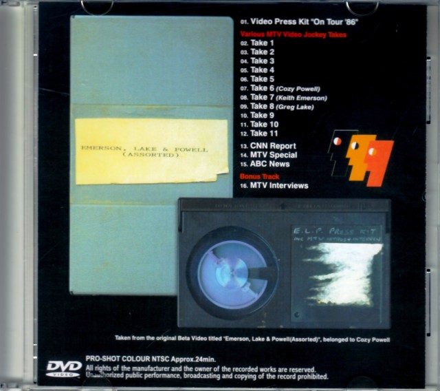 コージー・パウエルが所有していた「Emerson, Lake & Powell(Assorted)」と題されたベータビデオをダイレクトにDVD化。冒頭は「On Tour '86」と題された3分50秒に及ぶ、ビデオ・プレス・キット。Touch And Goのクリップ、3人のインタビュー、未発表のプロショット・ライブの数々を織り交ぜた見応え満点の内容。続いてはMTVのビデオ・ジョッキーを務めたときの映像素材を全て収録。これらと高画質でまとめて観れるのは非常に貴重。3人のパーソナリティが垣間見れる貴重なテイクの数々。Take 5ではミニ・キーボードを膝の上で弾くキースと、椅子をスティックで叩きながらリズムをとるコージーの姿はちょっとした見ものです。後半はCNN Report、MTV Special、ABC Newsとそれぞれの曲でのショート特番を収録。ラストはボーナストラックの扱いで約5分のMTV ロングインタビューを追加収録。