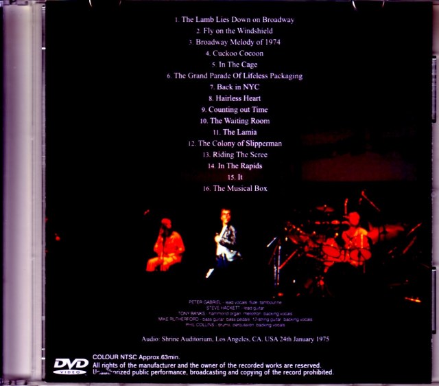 01. The Lamb Lies Down on Broadway 02. Fly on the Windshield 03. Broadway Melody of 1974 04. Cuckoo Cocoon 05. In The Cage 06. The Grand Parade Of Lifeless Packaging 07. Back in NYC 08. Hairless Heart 09. Counting out Time 10. The Waiting Room 11. The Lamia