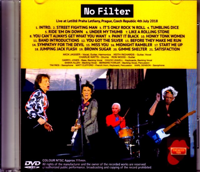 と、このようになっています。先日行われたばかりの最終ワルシャワ公演はまだ到着しておりませんが、それ以外のヨーロッパ大陸4公演はすべて映像化。本作のプラハ公演は、最後から2番目となるコンサートでした。そんなショウを収めた本作は、これまでの映像レポートの中でも格別の極上作。全部で5台のカメラを駆使してショウ全曲を組み上げていますが、だからと言ってマルチカメラ編集ではない。極上のメイン・カメラで大部分を通しており、それで欠けている4曲「Ride 'Em on Down」「You Got The Silver」「Before They Make Me Run」「Sympathy For The Devil」を別アングルで補完。当日の全曲を現場体験できるように仕上がっています。5台のカメラはそれぞれに遮蔽物なくステージを直視できる極上ショットなのですが、やはりポイントはショウの大部分を占めるメイン・カメラ。これがもう、最高に素晴らしい。ステージやや右寄りから見上げるポジションで、恐らくは最前列。視点を下げてみても目に映るのはスタッフばかり(「Under My Thumb」ではカメラピットで子どもを抱えた女性が座ってショウを観ていますが、いわゆる車椅子席なのでしょうか)で前列客の姿が映らない。ただひたすら間近なミックやキースのドアップが美しく描き出される。コンサートのベスト・シートは好みによって異なりますが、手を伸ばせばメンバーに触れられそうな最前列は人気No.1。そんな特等席中の特等席の光景を独り占めできる映像なのです。もちろん、どれだけ素晴らしい特等席でもサウンドがダメなら台無し。しかし、本作にその心配は不要です。通常、最前列は音の回り込みが欠点になるものの、本作の現場は野外。回り込むどころか反響さえ一切なく、PAダイレクトなサウンドを美味しく拾っている。最前列ですから大歓声の熱狂も背後に広がるばかりで演奏音との間に割り込むことがなく、クリアでオンな感触を思う存分味わえるのです。そんなクオリティで描かれるのは、ツアー最終盤に向けた完成度の高いショウ。エディンバラ公演から約1ヶ月ぶりの再演となる「Under My Thumb」は個性的なものの、その一方でオープニングの「Street Fighting Man」はほぼ定番化してきましたし、日替わり曲の「Ride 'Em on Down」「Like A Rolling Stone」も驚きより“2018年らしさ”まで感じる。キース・コーナーも「You Got The Silver」も「Before They Make Me Run」であり、今年最多の組み合わせ。レアなサプライズではなく、これぞ“NO FILTER 2018”とさえ感じるような王道めいたショウなのです。とにもかくにも、夢の最前列体験。これに尽きます。数々の傑作映像で“NO FILTER TOUR”をリアルタイム・レポートしてきましたが、ここまでの特等席でショウを体験できる映像はありませんでした。ショウをトータルに把握できる映像も素晴らしくはありますが、誰もが一度は体験したい最前列ではどんな光景が見られるのか……それを極上クオリティで教えてくれる貴重映像です。この夏の想い出に最高な1枚。