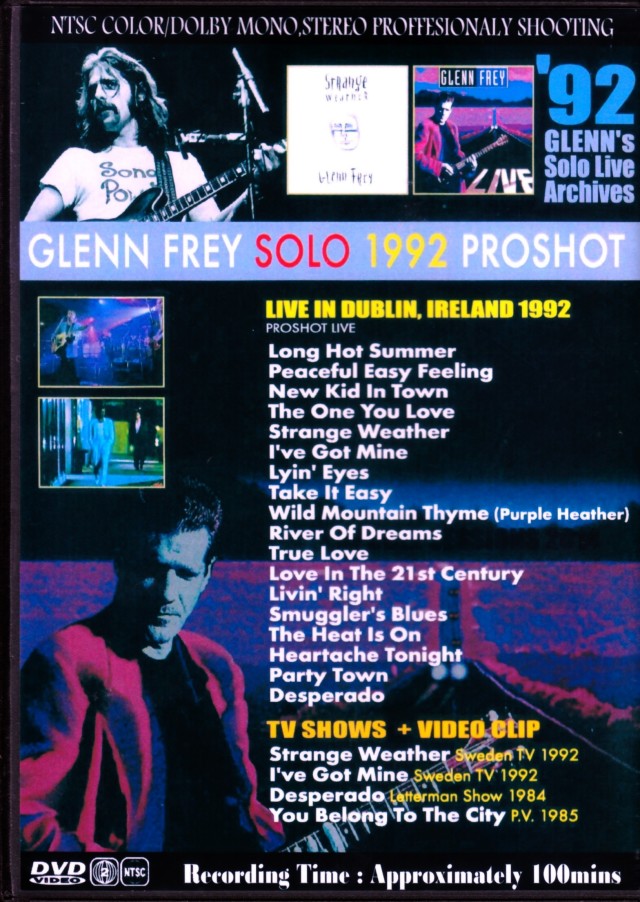 2016年1月18日に急逝したグレン・フライに追悼の意を込めて、ソロ時代の活動から、1992年アルバム「Strange Weather」リリース後のツアーから、アイルランド、ダブリンでのライブをマスター映像よりダイレクトにDVD化。以前はVHSやLDでオフィシャル・リリースされていたものの、現在は入手困難となっており、ビバリーヒルズ・コップでヒットした"The Heat Is On"や、マイアミ・バイスからの大ヒット、"You Belong To The City"などのソロ・ナンバーに加え"偽りの瞳"、"New Kid In Town"、"Take It Easy"など、もちろんイーグルスの名曲も披露している90分。さらにボーナスとしてスウェーデンや、レターマン・ショーなどの貴重なTVライブや、80年代ヒットの"You Belong To The City"のPVも追加収録した、ファン必見のトータル106分。