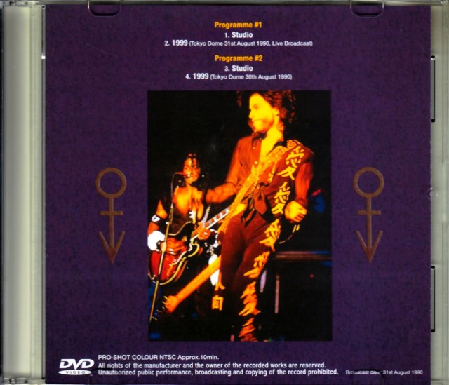 史上最高クオリティなだけでなく、当時の“時代の匂い”までも濃厚に伝えてくれる傑作プロショット『PRINCE in JAPAN '90』。さらに時代感覚が溢れるテレビ番組をお贈りします。本作には某民放局の番組が2種類収められており、どちらも東京ドームで演奏された「1999」をフィーチュアしたもの。両番組とも同じ映像マニアが秘蔵していたマスターを使用しており、当時そのものの極上記録が見られる傑作なのです。まず登場するのは、サングラスがトレードマークの某有名音楽番組。コンサートが行われている真っ最中に放送されたもの。プリンスをテーマにしたコーナーを流しつつ、「1999」を生中継するのです。その映像自体は生中継だけあって荒っぽい仕上がりで、尺も1分弱といったところなのですが、なんとも貴重なマルチカメラのプロショット。そして、それが流れる番組中のリアルタイム感も凄いのです。その中継に至るまでのスタジオ会話と企画も収録しているのですが、恐らく許可が出た「1999」に合わせるためなのか、VTRと早口コメントでネタを詰め込んでいく。そのネタもまた時代感覚爆発でして、「あなたもここで外タレに接近!?」と題し、来日中のミュージシャンがよく行く店を次々と紹介していく。プリンスやマドンナ、デヴィッド・ボウイが現れたというディスコ、マイケル・ジャクソンが行く焼き鳥屋、ジョン・ボン・ジョヴィ御用達のラーメン屋、ヒューイ・ルイスの通うサウナ等々など、早口でまくし立てる。実際に食べたというメニューを再現した「ミック・ジャガー定食(1,500円)」も紹介されます。日本の場組だけに、音楽とまったく無関係なのはいつものこととは言え、それにしてもミーハーすぎると言うか、制作者の「ファンはこういうもの」がやけに偏ってると言うか………サングラスの司会者が思わずつぶやく「本当かね」がすべてを物語っています。さらにスタジオでは「偶然、外タレに逢った話」になっていくのですが、そこでも象徴的女性アイドルが「ハードロック・“キャ”フェで……」と、珍妙な発音で国際派アピールしてくる。隅々にまで漂う“なんだかな”のムード。これもまた、“1990年の洋楽”が持っていた一面を象徴している映像なのです。一方、もう1つの番組は、某公共放送局の「東京発エンタテインメントニュース」。こちらは生中継ではないものの、前日となる「8月30日」のプロショット映像でやはり「1999」が見られる(2番組とも同じ曲ということは、この曲だけ許可が下りたのかも知れませんね)。ライヴシーンは2分ほどのワンカメですが、可能な限り長い尺をステージ映像と当日ショウのレポートに費やす構成には、公共放送局のマジメさが透ける。その中では本番直前に成田空港に到着し、そのまま会場へ直行したエピソードも交えて語るなど、リアルタイムならではの空気感が猛烈に吹き出す番組なのです。2番組で合計10分ほどではありますが、貴重なプロショットに加え、短い中に各局の洋楽観までもが現れて“1990年の日本”が強烈に匂ってくる傑作映像です。甘酸っぱくも最高に輝いていた、あの時代、あの匂い。どうぞ、胸いっぱいにお楽しみください。
