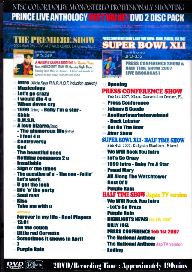 2016年4月21日、世界中のファンに衝撃となったプリンスの訃報。その天才アーティストを追悼の意を込めた本タイトルは、2004年と2007年のレア・プロショット・ライブを、トータル3時間にわたり、すべてマスター・クオリティー、プロショット映像にてコンパイル。まずdisc:1には、2004年に復活を知らしめたアルバム「MUSICOLOGY」リリースに伴うUSツアーより、そのオープニング・ナイトとなった、3月29日ロスのステイプル・センターでのショーを収録。 この模様は全米各地のシアターにて生中継され、その流出完全コンプリート版が本作品で、同アルバム・ナンバーはもちろん80年代のキラー・チューンも多数披露された2時間23分に及ぶ一大スペクタル・ショーとなるもの。さらにdisc:2には2007年、全米アメラグの祭典、スーパーボウルでのハーフタイム・ショー関連のライブ映像を1時間にわたり収録。まず2月1日に行われた記者会見でのスペシャル・ライブでは、スーパーボウル本番とは全く違う選曲で、いきなりハードなギターイントロからまさかの”ジョニー・B・グッド”で始まり、ツインズが妖しく絡む”Anotherloverholenyohead”でもジミヘンばりのギターが炸裂。そして当時の新曲”Get On The Boat”はファンキー全開となり、その圧巻のパフォーマンスで記者席も呆然。そして2月4日のスーパーボウル本番り、全8曲怒涛のメドレーで雨の中の”Purple Rain”で大団円。なお別オンエアーも含めた2ヴァージョンを収録のうえ、US:TVでのリポート、ビリー・ジョエルの国歌斉唱、及び記者団とのユーモアたっぷりのやり取りが面白い記者会見もフル収録。2000年代のライブ映像としてはいずれも必携必見マスト・アイテム。
