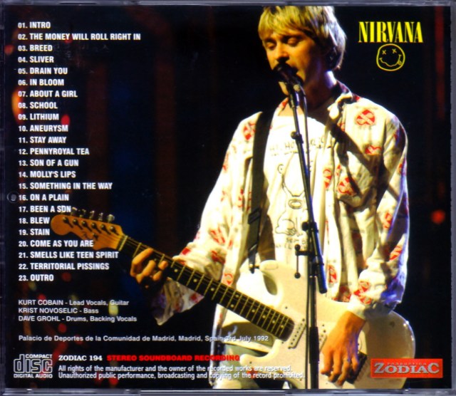 これが日本公演後の足取り。本作は欧州ツアーの9公演目にあたるため、時期としては4ヶ月後ですが、ライヴは11公演後だったのです。そんな本作は、近年になって登場したフル収録のステレオ・サウンドボード。昨年になって公式フォーラムに短期間だけアップされ、すぐに消されてしまったもの。この日は当時から「Aneurysm」プロモクリップにも使われるなど、プロフェッショナルな収録があったことは知られていたのですが、「まさかフルショウがサウンドボードで録音されていたとは!」と驚かせた音源なのです。しかも、単にフル収録なわけではない。そのクオリティは、そんなレアっぷりがまったく似合わない凄まじさ。流出サウンドボードというと、ぶつ切れだったり、ミックスがいい加減なことも珍しくないのですが、本作はほぼオフィシャル級。「Pennyroyal Tea」の中盤でヴォリュームがやや下がることを除けば、完璧なサウンドボード音源なのです。そのままリリースしようかとも考えていたのですが、本作ではさらに最新・細心のリマスタリングも実施。この音源を提供してくださった世界的権威の研究家の指導の下、高音をよりブライトに整えて全体を調整。グレイトな原音を極限のオフィシャル次元にまで高めてお届けすることにいたしました。 そんなサウンドで描かれる黄金期NIRVANAは、まさに時代の女神に愛された現象次元のロックを轟かせている。先日ご紹介した日本公演のサウンドボード・アルバム『TOKYO 1992』では、初(そして唯一の)来日のムードがたっぷりでした本作もまた、彼ら初のスペイン公演。行く先々で初めての土地・人種に触れながら世界を席巻していくNIRVANAの熱演が耳元サウンドでねじ込まれるのです。とは言え、本作が日本公演と同じようなものかというとそれも違い、ショウの内容はかなり異なります。FANGのカバー「The Money Will Roll Right In」、THE VASELINESのカバー「Son Of A Gun」「Molly's Lips」、『NEVERMIND』の「In Bloom」「Stay Away」まで披露。この時期には、オフィシャルでも『LIVE AT READING』が発掘されていますが、そこでは聴けない「Pennyroyal Tea」「Stain」も演奏されているのです。特に注目なのは「The Money Will Roll Right In」と「Son Of A Gun」。NIRVANA全史を見渡してもホンの数回しか演奏されていない激レア曲でありながら、公式裸足のサウンドで聴けるのです。まさに世界を塗り替え、歴史を書き換えていた“現象”NIRVANAによる、初めてのスペイン・ツアー。日本公演とも『LIVE AT READING』とも違う名曲をたっぷり披露する熱演をオフィシャル・クオリティの特級サウンドで、しかもフルショウで聴ける大傑作です。